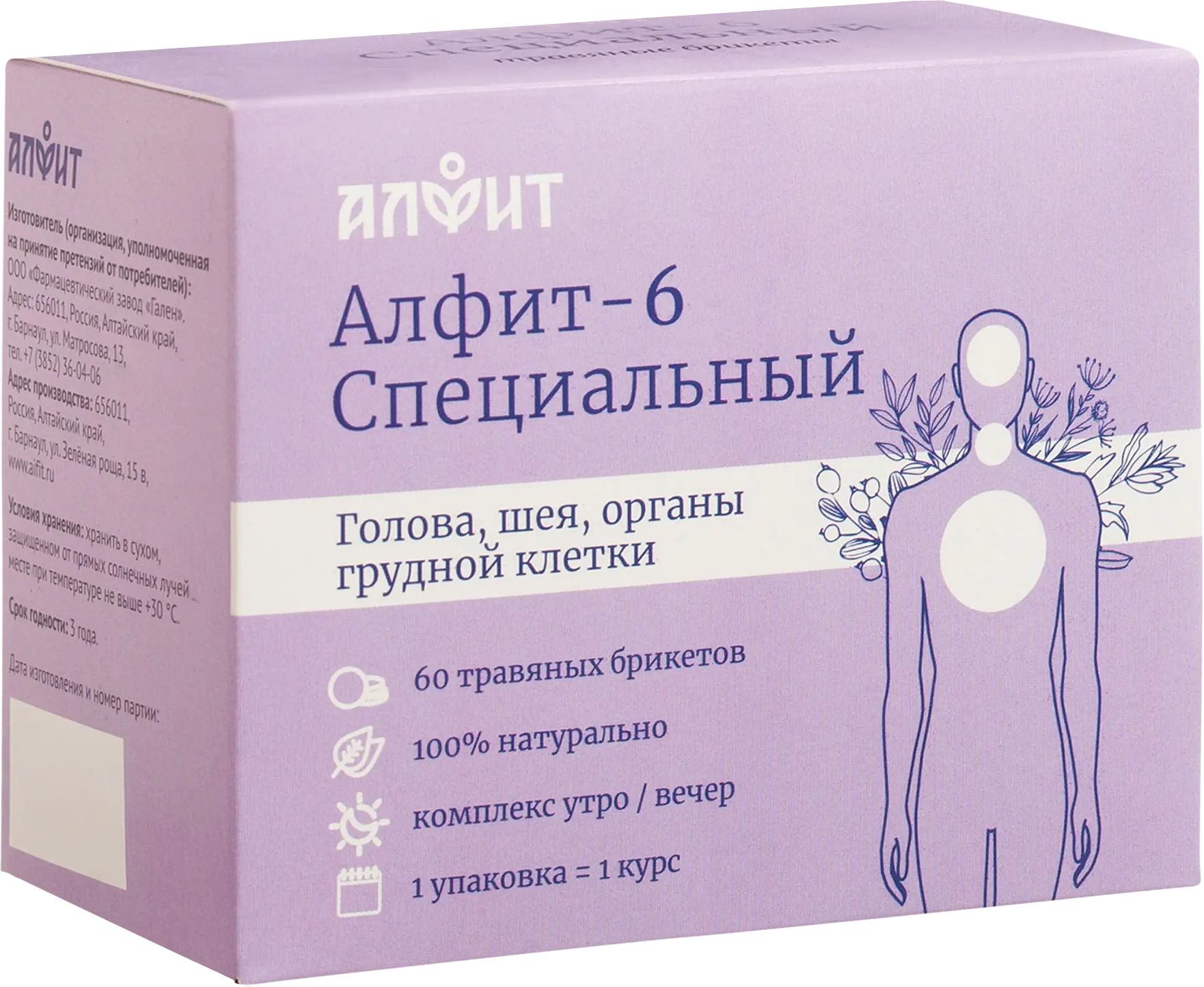 Комплект «Алфит 6 Специальный» состоит из двух упаковок: утреннего и вечернего фитосбора. В каждой из них – 30 брикетов по 2 грамма. Вечерняя форма отличается добавлением успокаивающих трав, благотворно влияющих на уставший за день организм.
