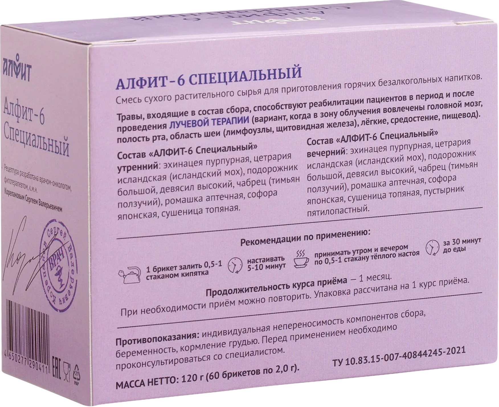 В каждом брикете содержатся исключительно натуральные измельченные травы без добавления химических элементов. Такая форма выпуска исключает передозировку и сохраняет биологически активное действие сбора, который можно готовить, заливая кипятком, не используя водяную баню. В состав фитосбора входят натуральные травы, действие которых на организм человека проверено веками.Уникальная рецептура фитосбора «Алфит 6 Специальный» была создана специалистами для реабилитации пациентов до и после лучевой терапии полости рта и грудной клетки. Свойства входящих в сбор трав способствуют реабилитации, восстановлению и устранению побочных эффектов после борьбы с онкологией указанной области.